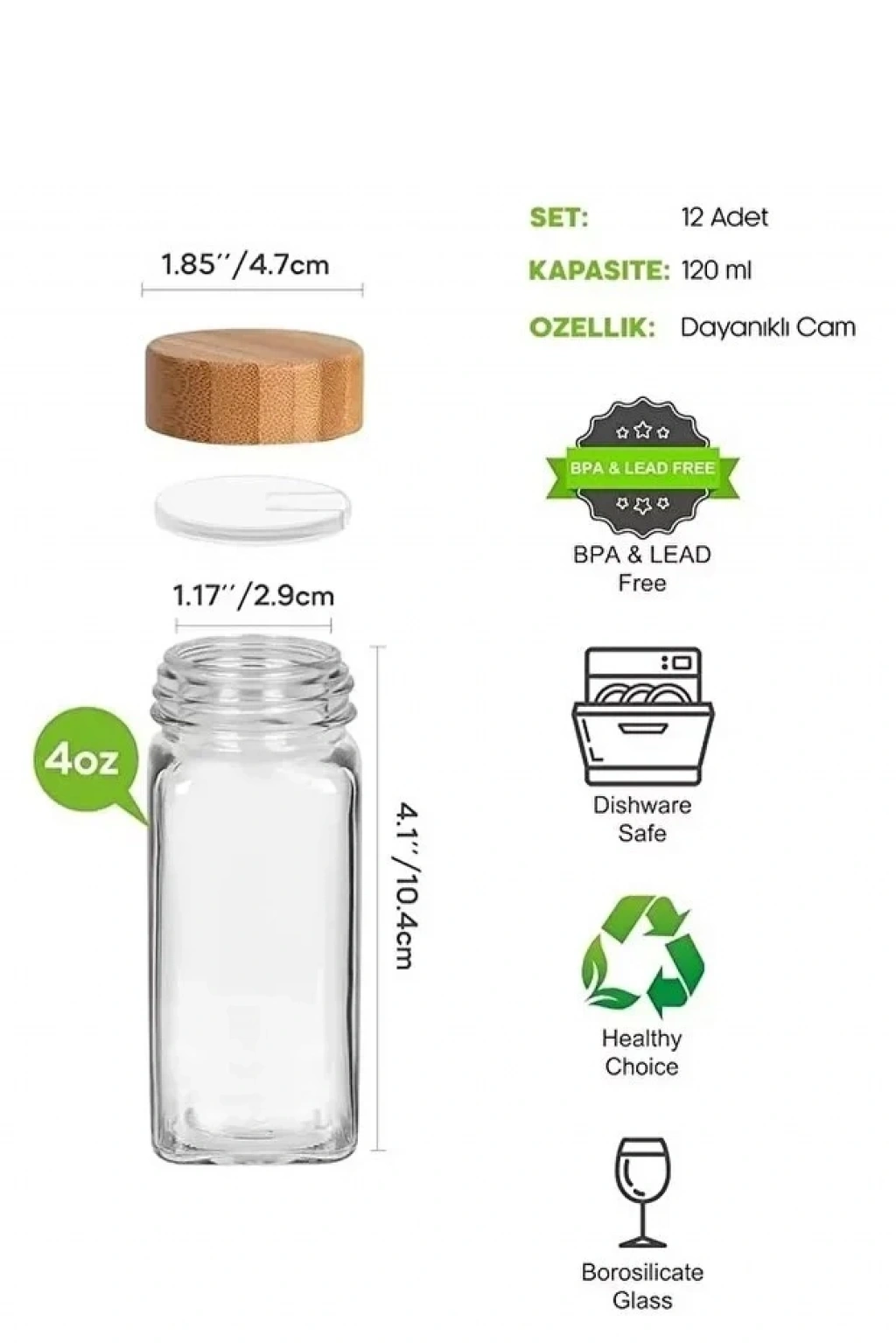 Etiketli bu yüksek şeffaflığa sahip 4 oz baharat kavanozları kalınlaştırılmış camdan yapılmıştır, %100 gıda sınıfı, BPA içermez ve bulaşık makinesinde yıkanabilir.